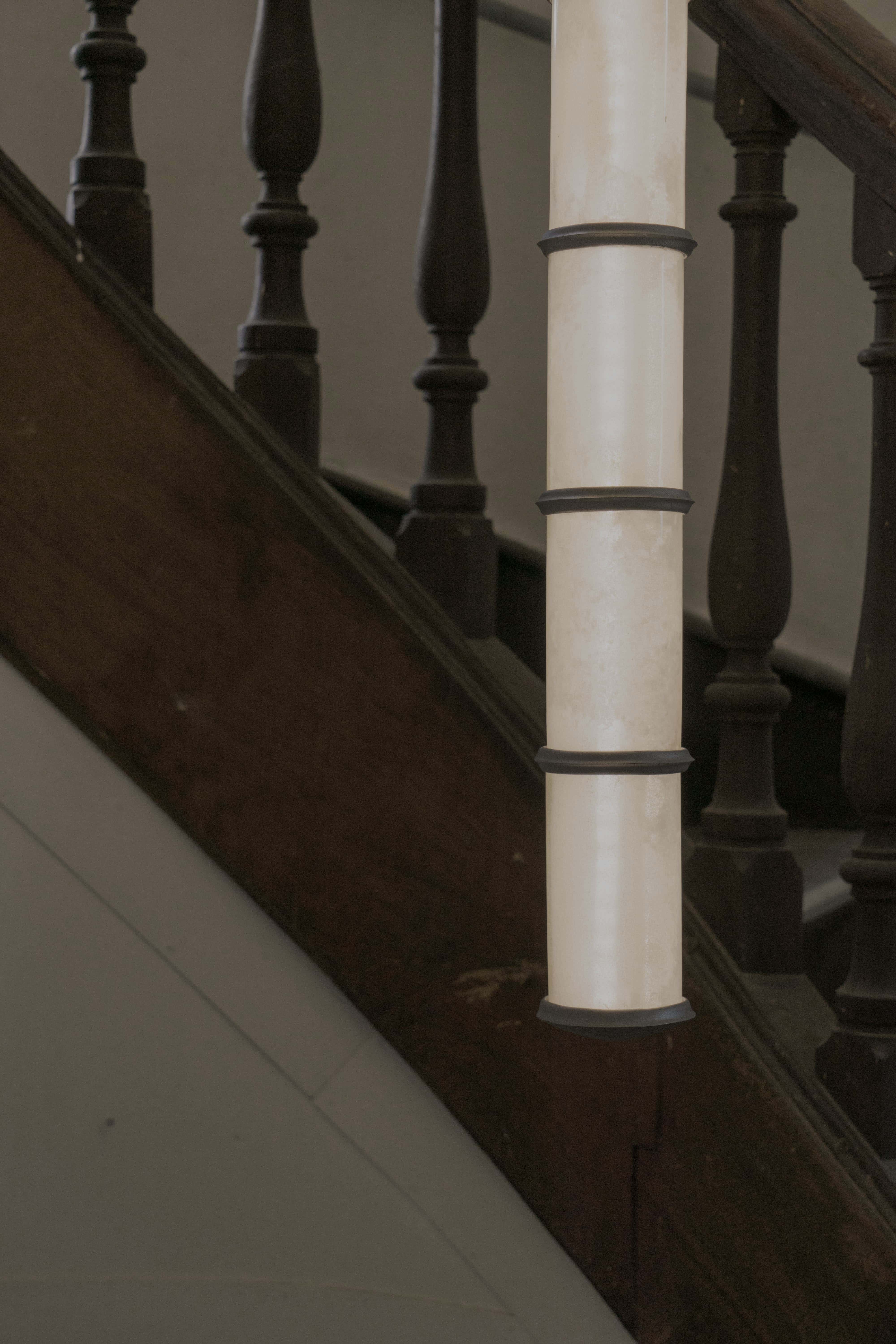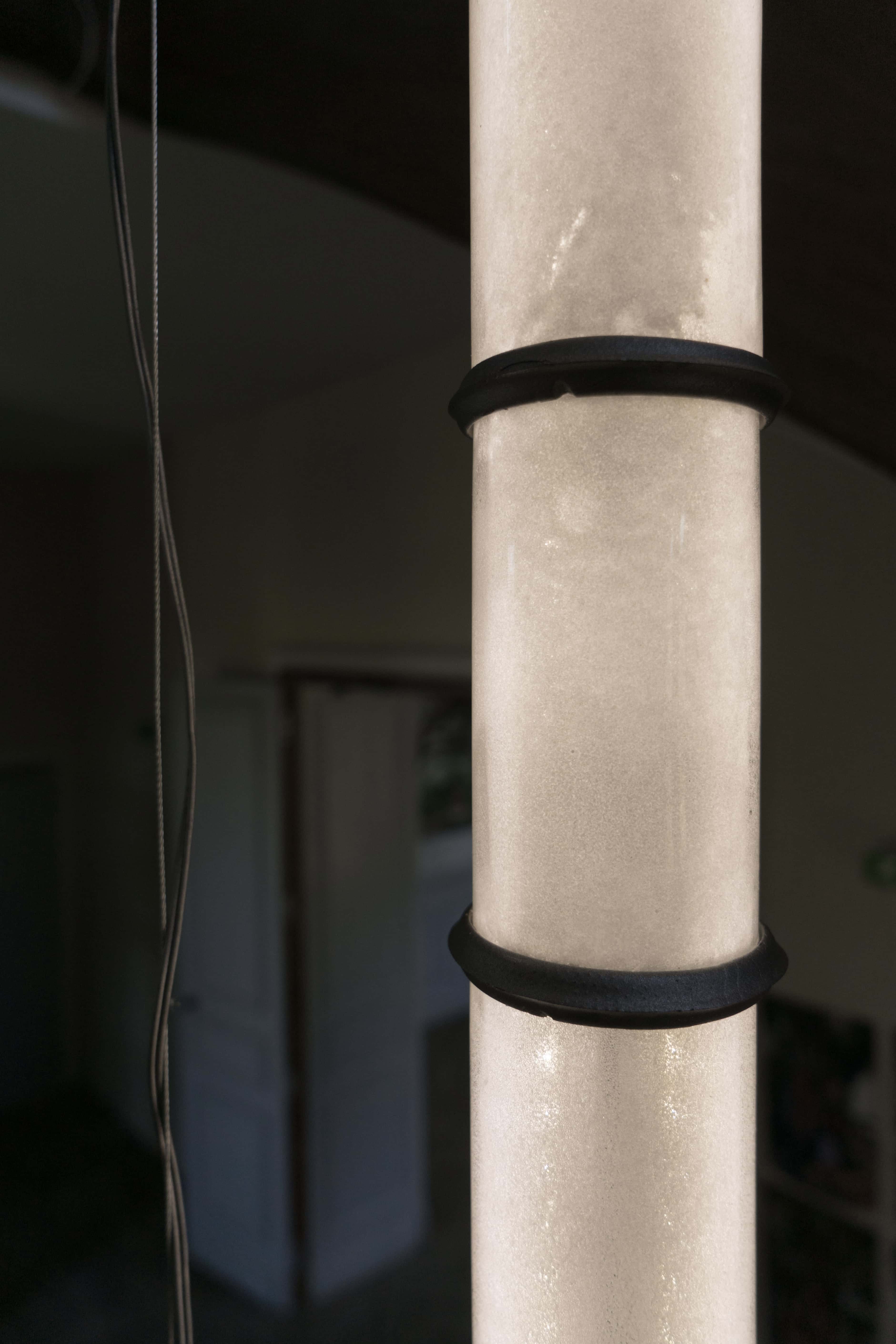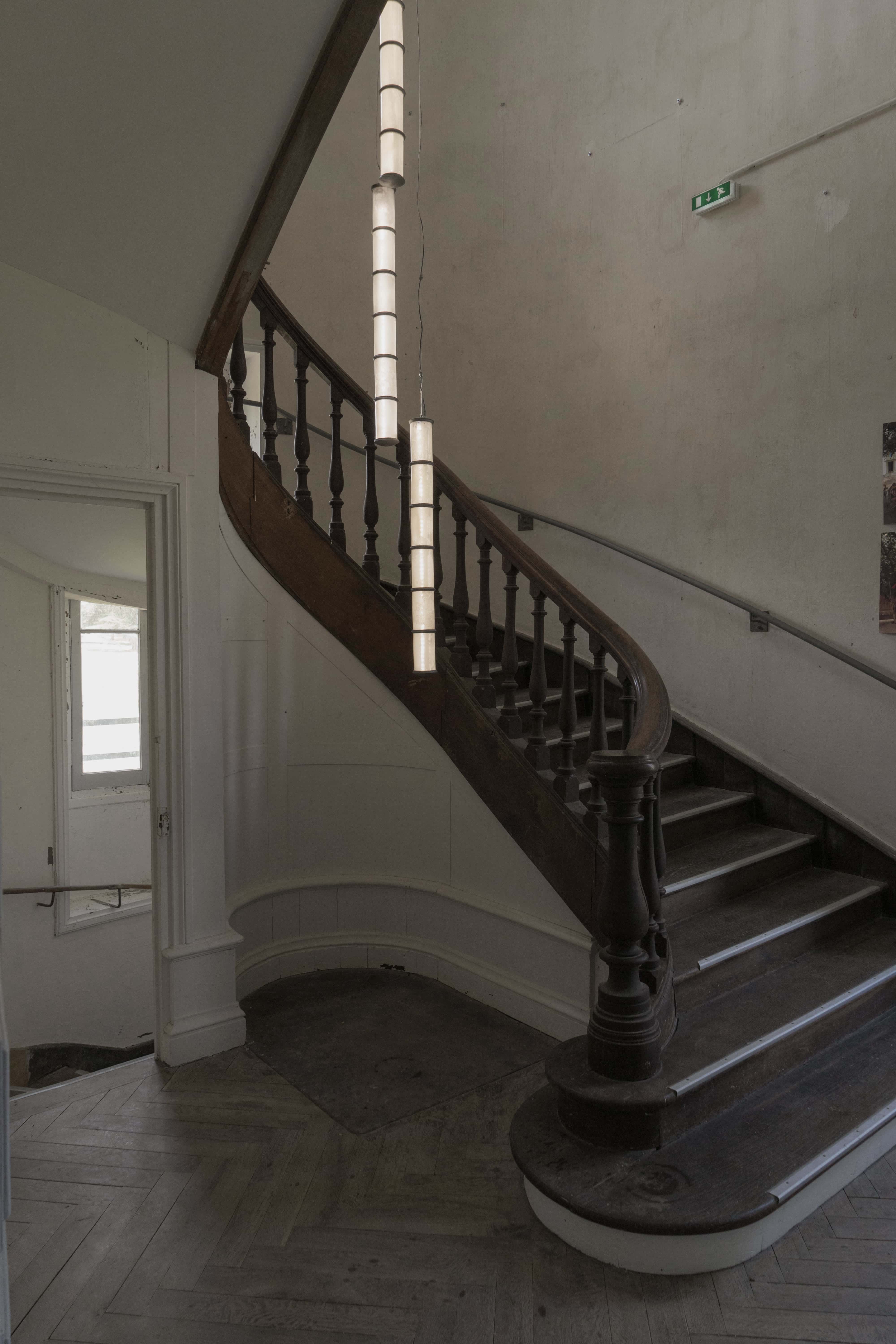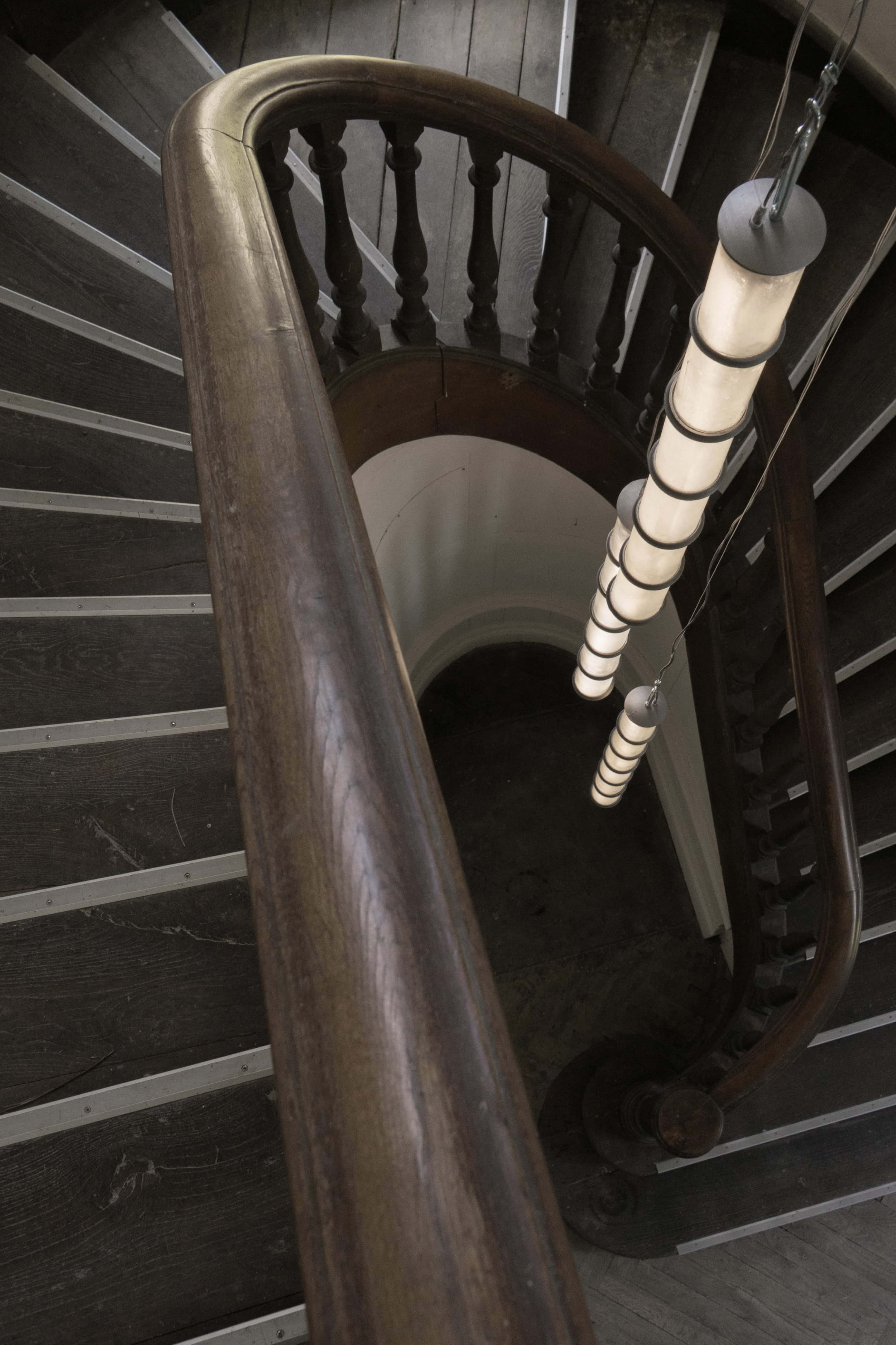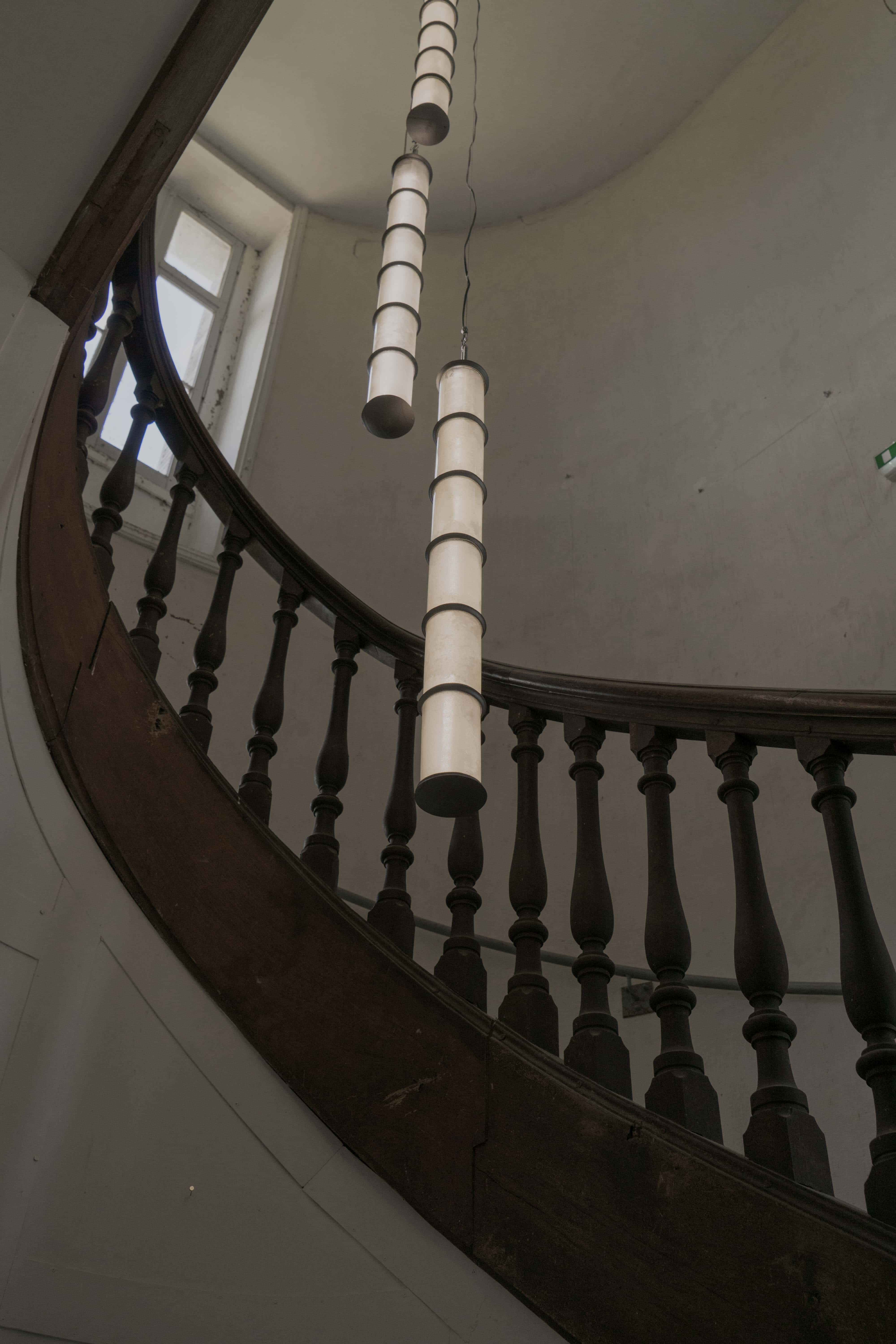 Collaboration with Pablo Bolumar Chateau Chandelier is a vertical lighting system for the stairs of the Chateau of Domaine de Boisbuchet, made with apple juice glass bottles stored in the basement. After being cut and frosted with salt, the glass pieces are assembled with cast aluminum components in one-meter arrangements that can be placed at different heights. Chateau Chandelier was developed with Anton Ripon and produced with Carlos Guisasola Suárez, installed with the help of Boris Grisot, and supported by Acción Cultural Española during my residency in Boisbuchet.