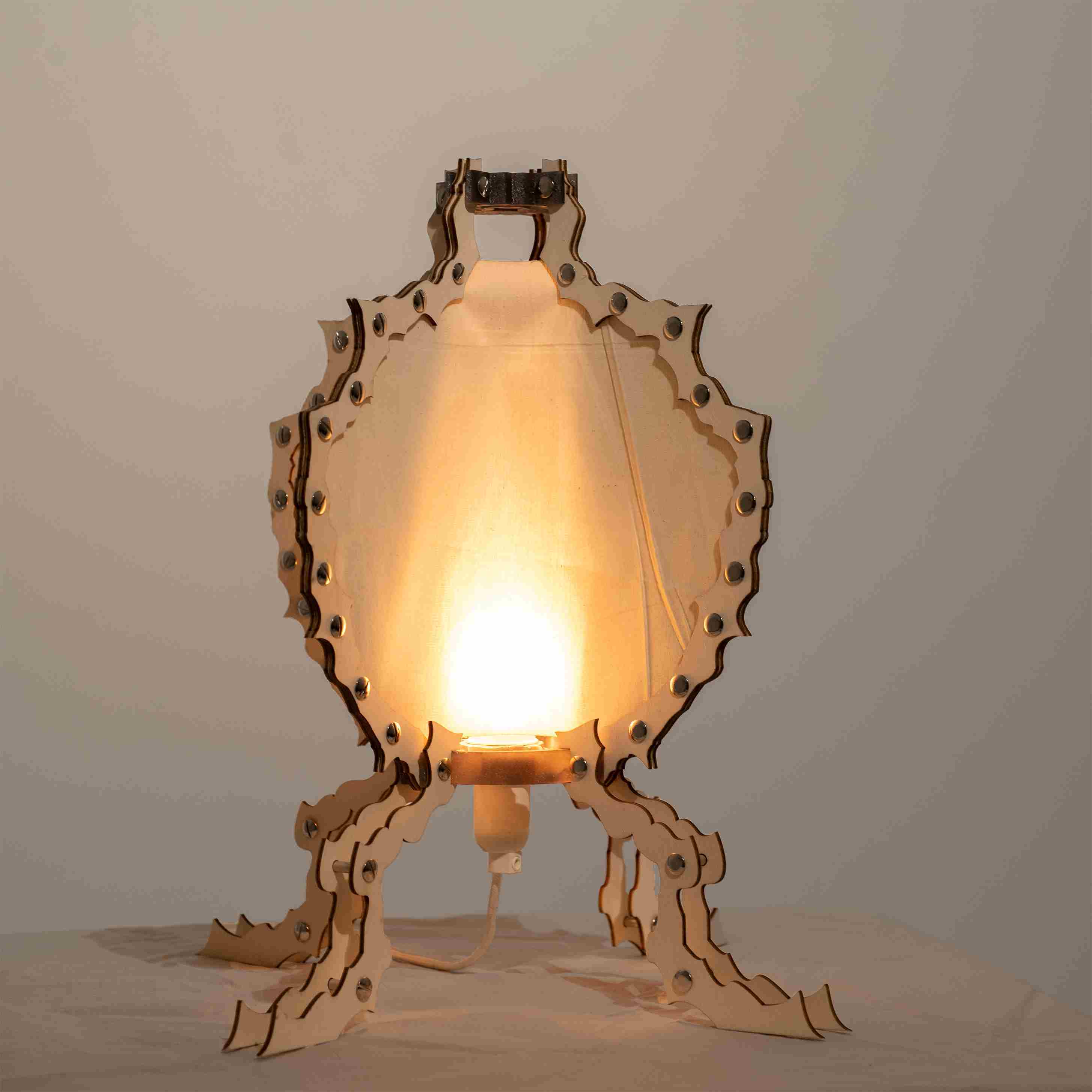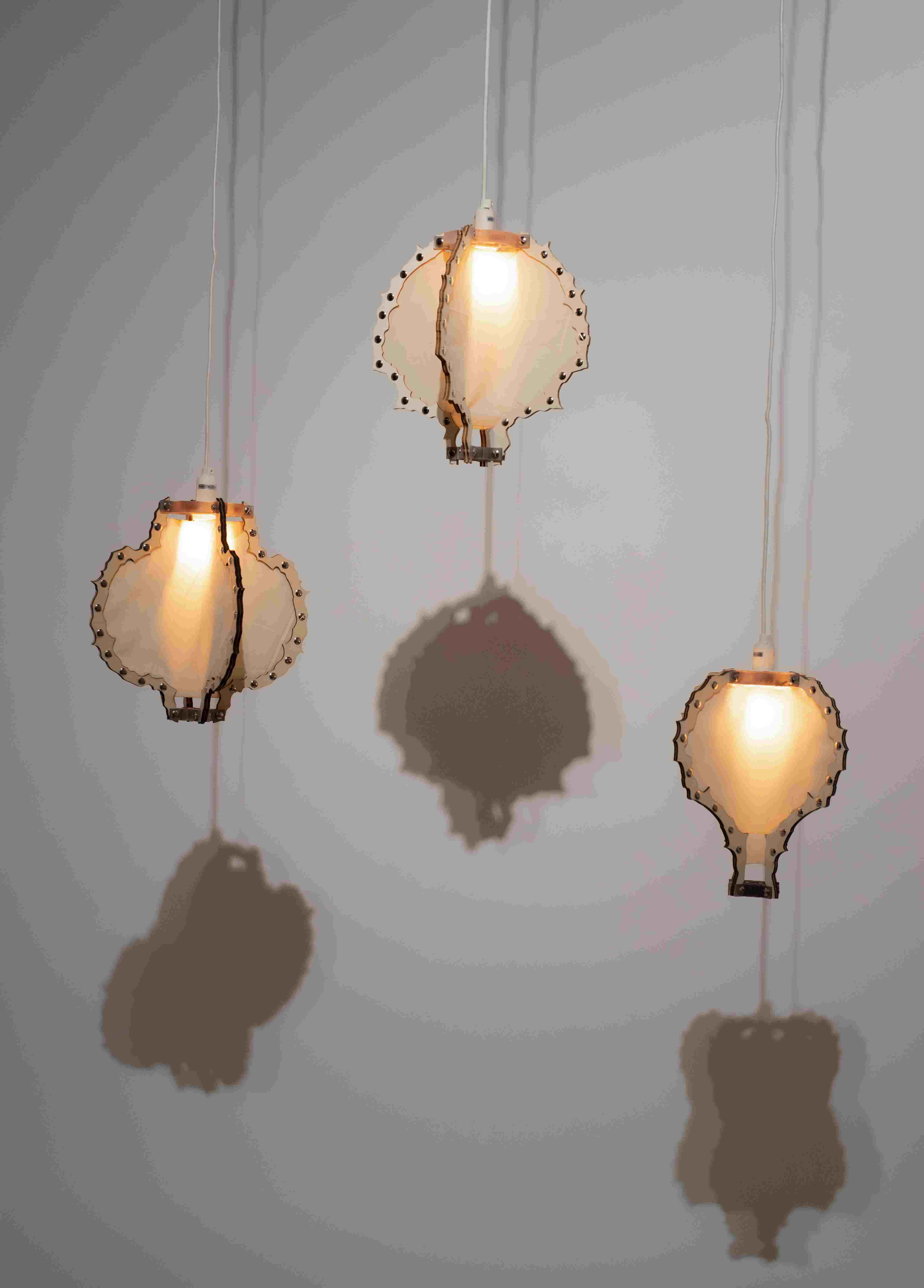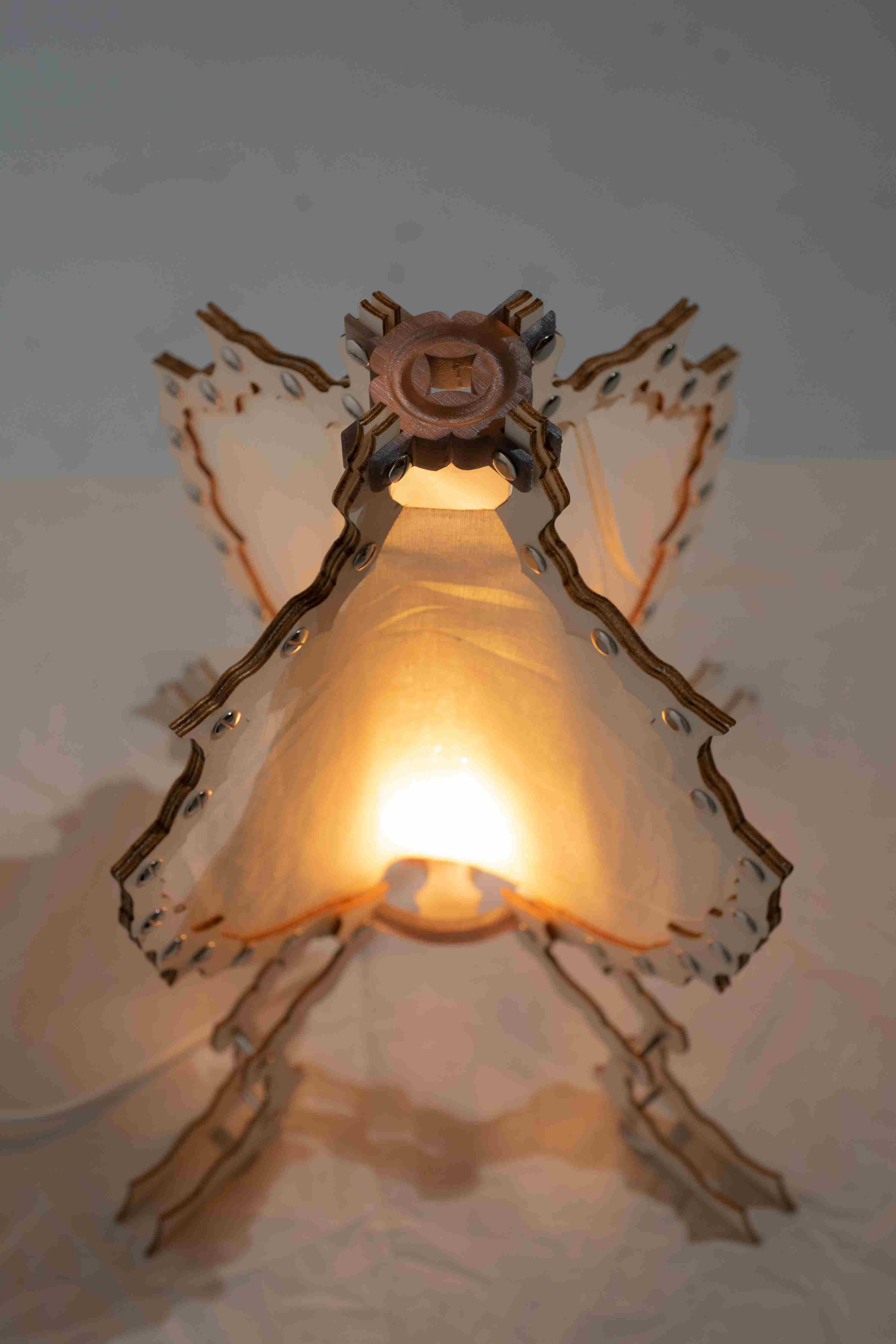 The first electric streetlights in Paris were installed in 1878. They were known as arc lamps, or Yablochkov candles. In 1875 Yablochkov left Russia and started his Paris business; by 1876 he was granted the French patent 112024 for his candles. The Yablochkov candles were first used commercially in 1877 in the Marengo hall of the department store Galeries du Louvre in Paris with an installation of 80 lamps. Their presence is mentioned by Émile Zola in his novel Au Bonheur des dames (Ladies paradise). In this occasion Paris was nicknamed city of lights. Inspired by the historic street lamps of Paris, the Chimera Lamp brings the iconic typology into the 21st Century. Titled Chimera based on the hybrid nature of combining industrial processes and influSDences with a more organic and spontaneous visual vernacular. Working with the concept of mutations, adaptability, and evolution, the systematic construction approach facilitates the possibility of exploring variations in the aggregate componenets comprising the structure. We chose processes that allow for maximum adaptability to habour the potential for infinite future variations. It is an expansion on the simple idea of rigid arms with pinched fabric to evolve from two-dimensional gestures into three-dimensions. Mutating from the public urban context of Paris into the homes of those who want to bring life to their interior landscapes. Materials: laser cutted plywood, 3d printed resin with silver powder, canvas, chicago bolts. Coming in three variations and two possible installations: standing (add legs) or hanging. Co-designed with Tony Tao Li under Studio Dogtooth