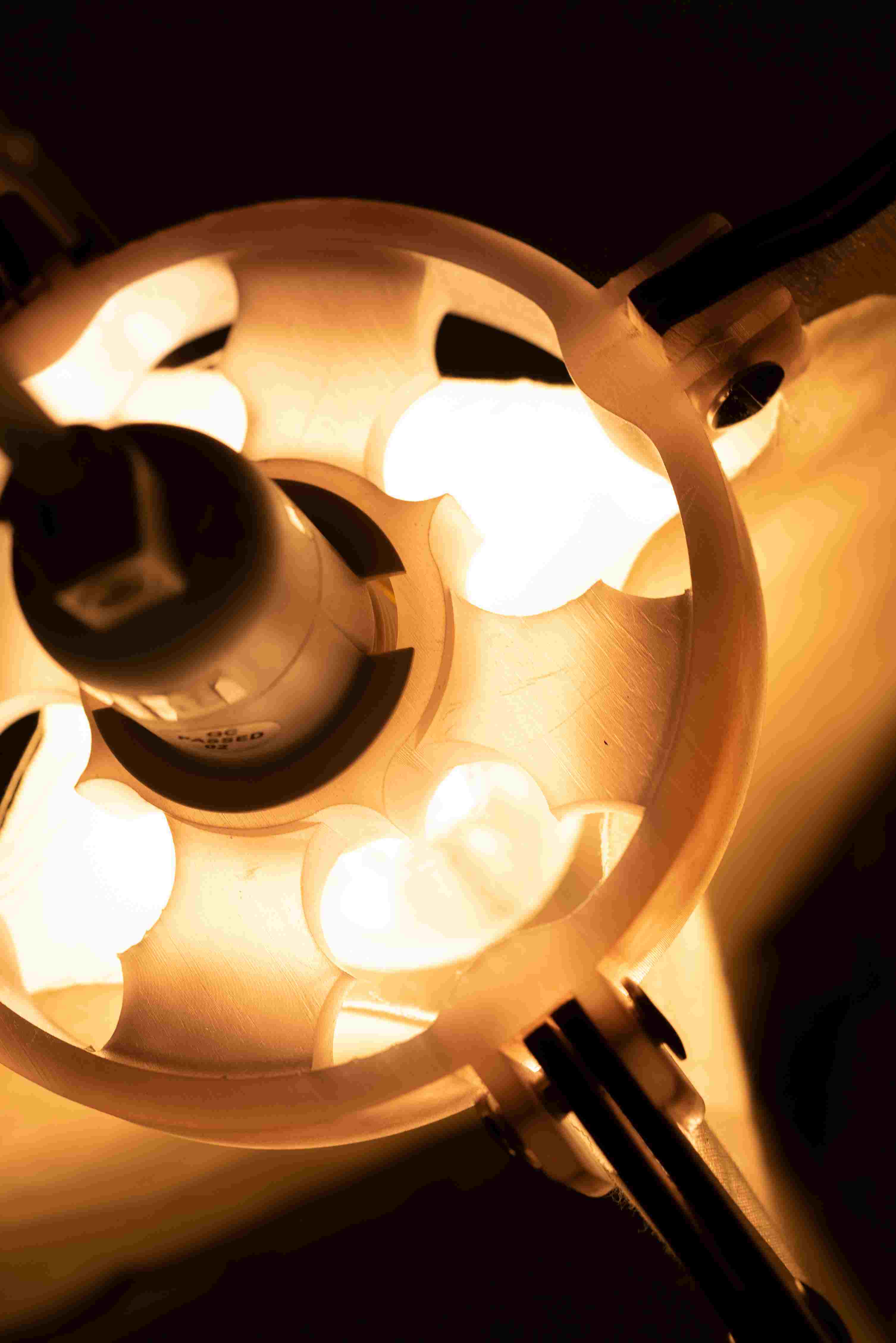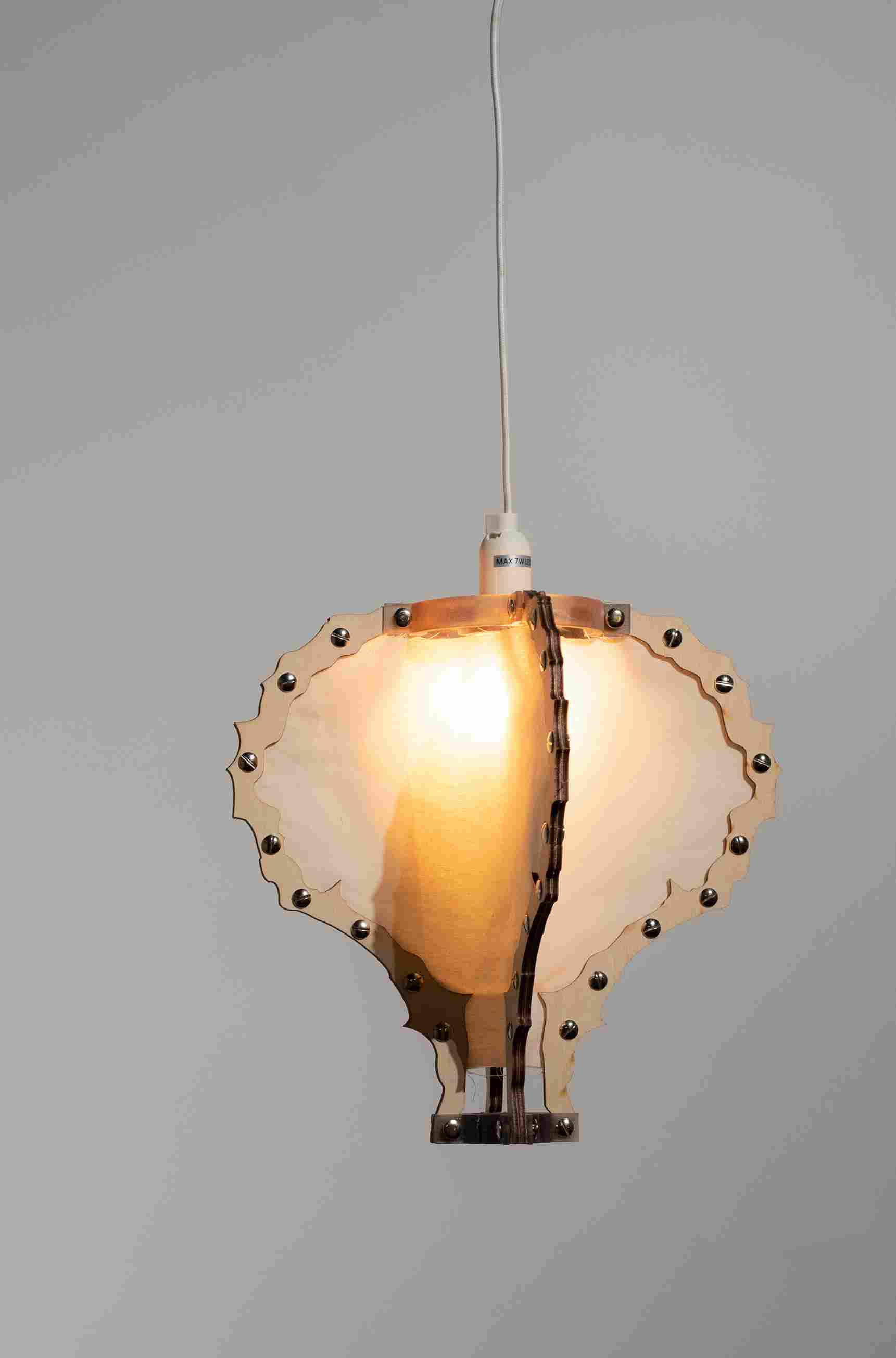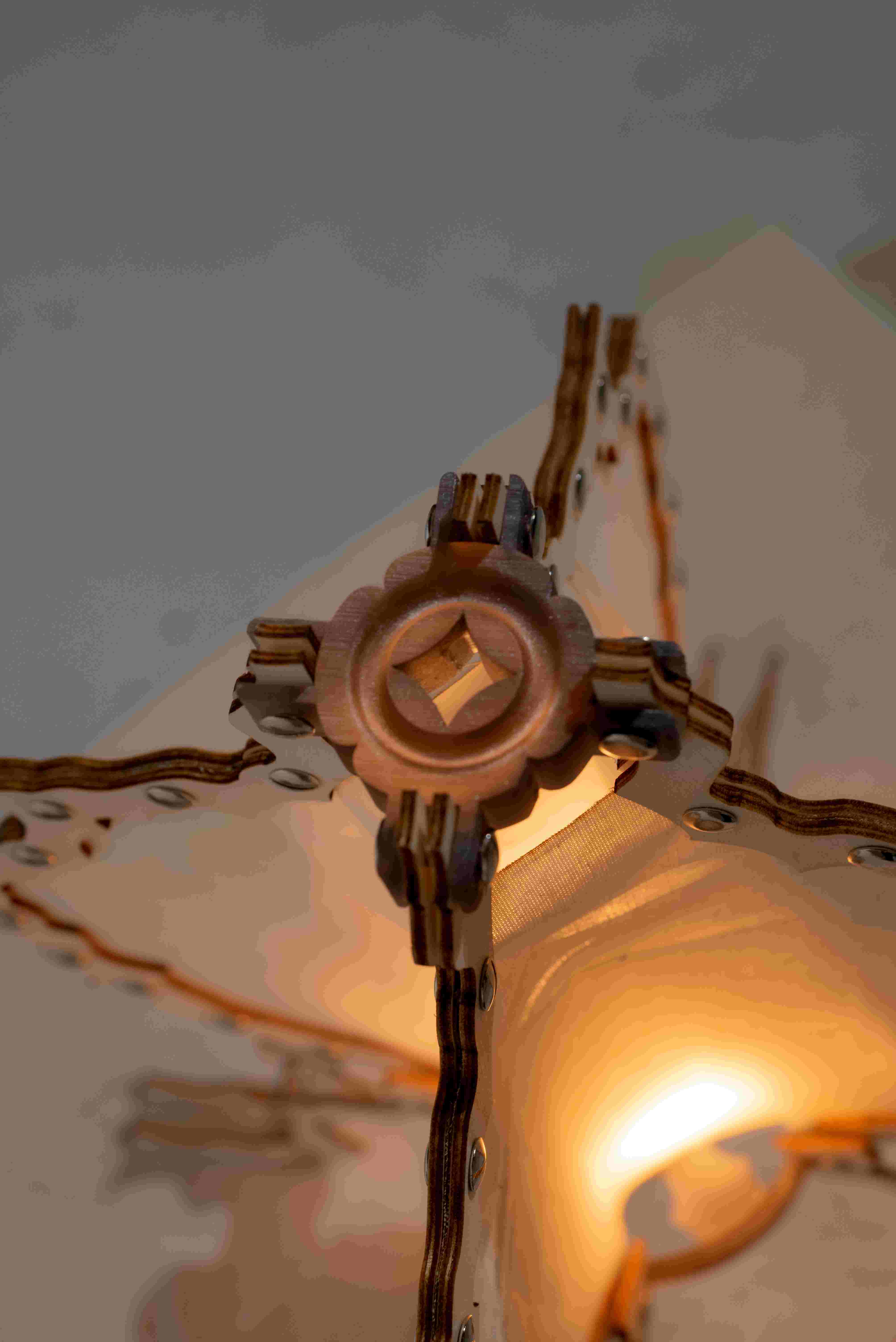 The first electric streetlights in Paris were installed in 1878. They were known as arc lamps, or Yablochkov candles. In 1875 Yablochkov left Russia and started his Paris business; by 1876 he was granted the French patent 112024 for his candles. The Yablochkov candles were first used commercially in 1877 in the Marengo hall of the department store Galeries du Louvre in Paris with an installation of 80 lamps. Their presence is mentioned by Émile Zola in his novel Au Bonheur des dames (Ladies paradise). In this occasion Paris was nicknamed city of lights. Inspired by the historic street lamps of Paris, the Chimera Lamp brings the iconic typology into the 21st Century. Titled Chimera based on the hybrid nature of combining industrial processes and influSDences with a more organic and spontaneous visual vernacular. Working with the concept of mutations, adaptability, and evolution, the systematic construction approach facilitates the possibility of exploring variations in the aggregate componenets comprising the structure. We chose processes that allow for maximum adaptability to habour the potential for infinite future variations. It is an expansion on the simple idea of rigid arms with pinched fabric to evolve from two-dimensional gestures into three-dimensions. Mutating from the public urban context of Paris into the homes of those who want to bring life to their interior landscapes. Materials: laser cutted plywood, 3d printed resin with silver powder, canvas, chicago bolts. Coming in three variations and two possible installations: standing (add legs) or hanging. Co-designed with Tony Tao Li under Studio Dogtooth