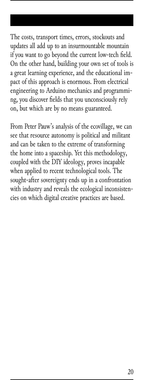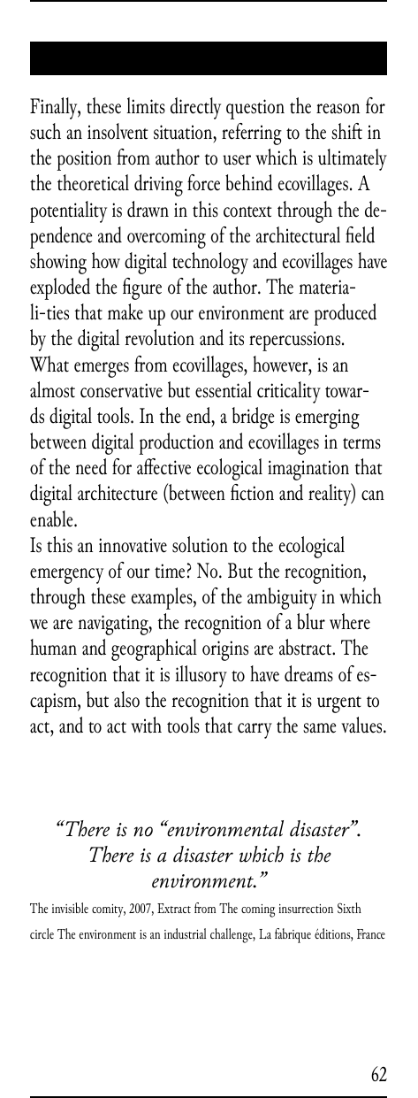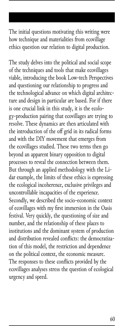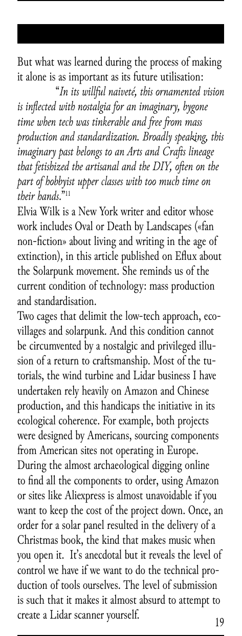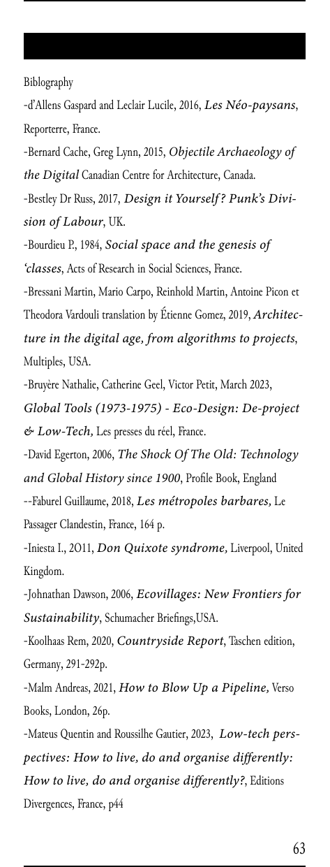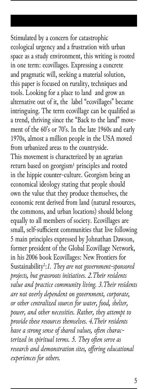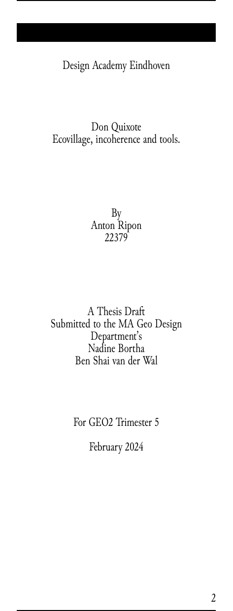 Online version available at actinmess.com/donquixote.pdf Stimulated by a concern for catastrophic ecological urgency and a frustration with urban space as a study environment, this writing is rooted in one term: ecovillages. Expressing a concrete and pragmatic will, seeking a material solution, this paper is focused on rurality, techniques and tools. Looking for a place to land and grow an alternative out of it, the label “ecovillages” came. This work looks at ecovillages in France and Netherlands, their relationship to tools and ecology and the position of architecture within this realm. Master thesis from the geo-design departement; the conclusion and the research sparked the project Site Drawing.
