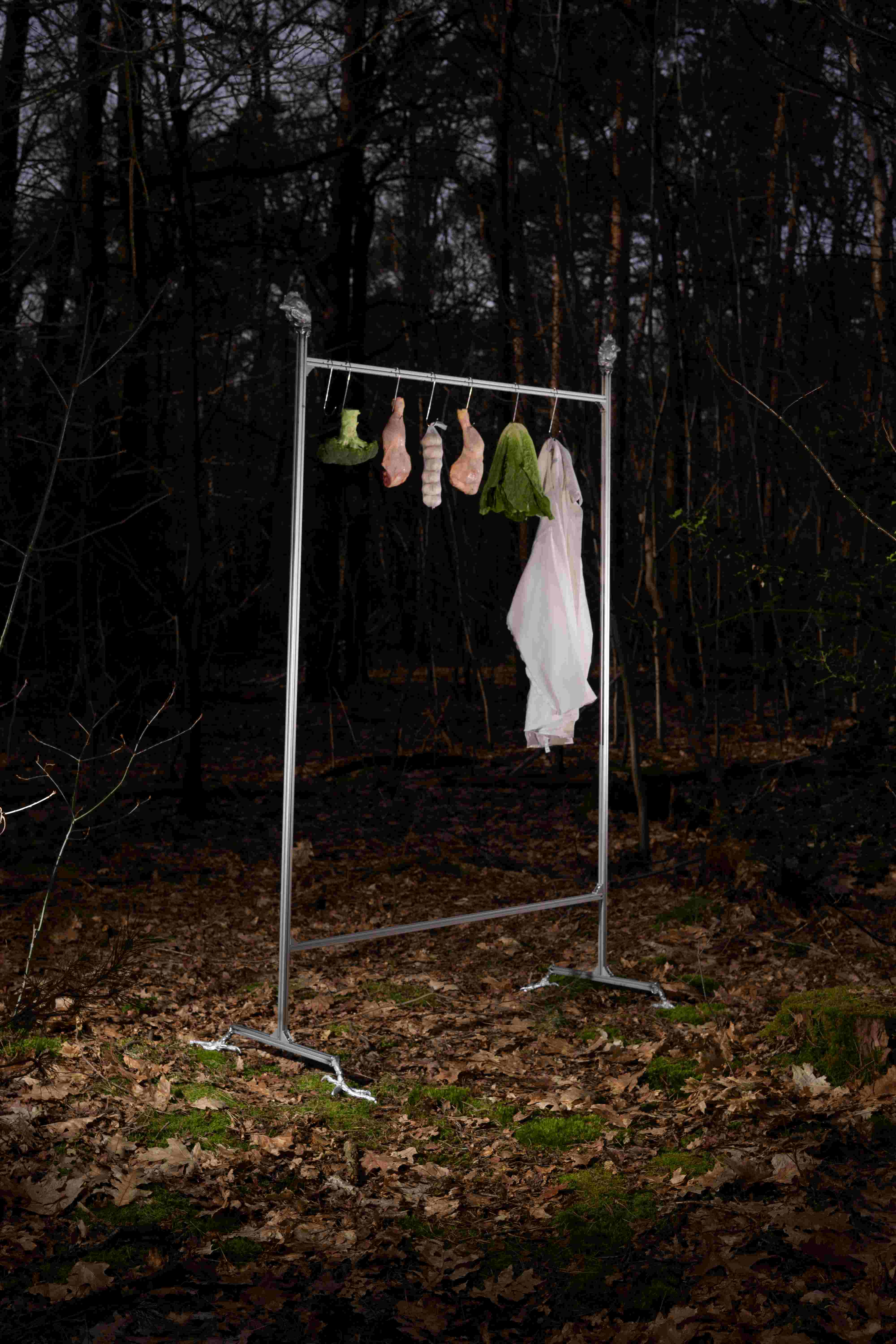 «The disappearance of animals from urban and rural landscapes and their cramming into factory farms has the effect of destroying both the mental image of the animal and the real link between animal and human beings. Placed on the margins of society, the slaughtered animal no longer exists as an individual.» AUBINIERE Sarah, Represent the slaughterhouse Agrarian refers to cultivated land or the cultivation of land. In Middle ages and renaissance period, the production of food was a primary inspiration for decorations and interior design. The hunt, the fields, the fishes and the farmer were represented in various narrations often romanticizing the production. Since the 60’s globalisation, the narrative of land cultivation have left the domestic spaces to be only contained in advertisment. The decorative components of today’s interior furniture is mainly an abstraction depraved of stories. What would a collection narrating the food production in 2024 look like? This is the question motivating this collection of four pieces: the chicken, the haystack, the pixel farming and the machinery are a selection of hyperobject represented in this collection. Poultry Delicassy is the first piece of this collection, it is a clothing rack in aluminium representing this mechanical cleaniness with a playfull and agressive twist. The chicken, hyperobject more then a sentient animal is displayed like a hunt trophy. Co-designed with Tony Tao Li under Studio Dogtooth